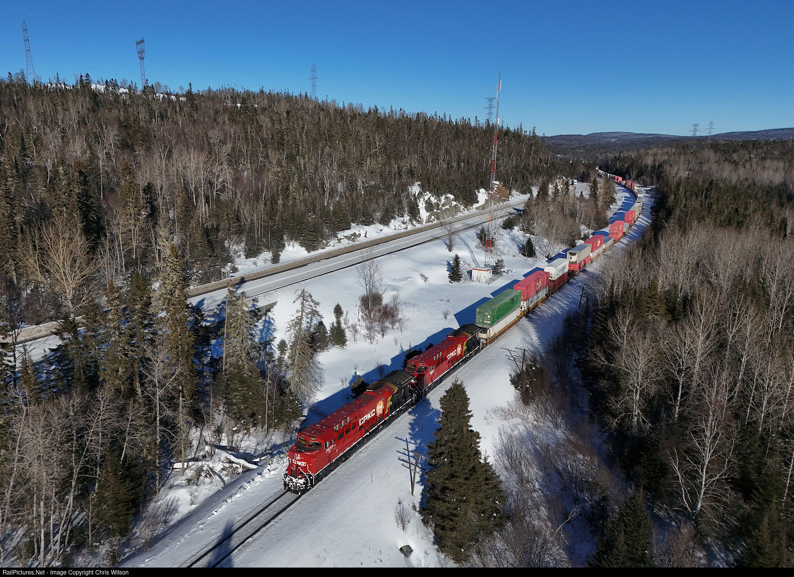 | New CPKC locomotives hauling 101's train bound for Vancouver parallels the Trans Canada Highway at Ripple, Ontario. Late afternoon winter sun has a steady stream of shadows at mileage 87 of the Heron Bay Subdivision. |