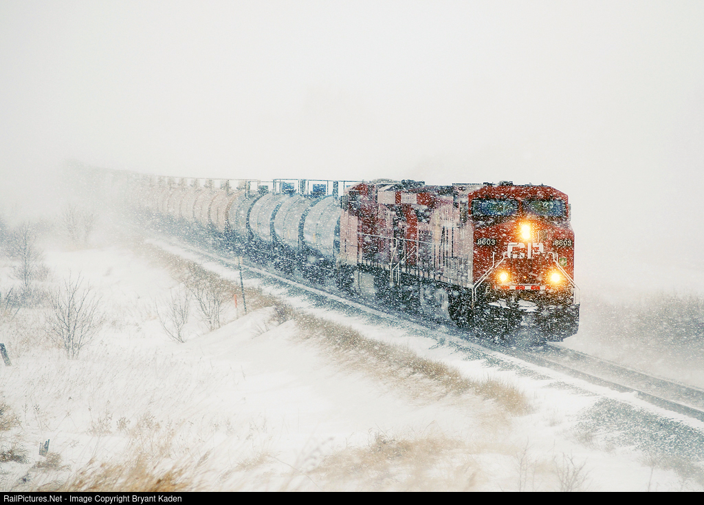 | A westbound Canadian Pacific train battles a blizzard as it rolls across west central Minnesota in February 2011. This experience made me understand how people have become lost in these kinds of conditions. There are stories of folks freezing to death close to their barn or farmhouse because they became so disoriented just walking between the two to check on their livestock. Some farmers would tie a rope between the two that they could then hold on to and follow to avoid this fate. The snowfall wasn't this intense when I walked a hundred yards or so into a field from my car to take the picture. The snow obviously got a lot worse by the time the train arrived, and when I turned around, I couldn't see where my car was. If it hadn't been for the railroad tracks that I could follow back to the road, I would've had a hard time knowing which way to walk. I don't venture out into these conditions as much anymore, but it can be an exhilarating experience! |