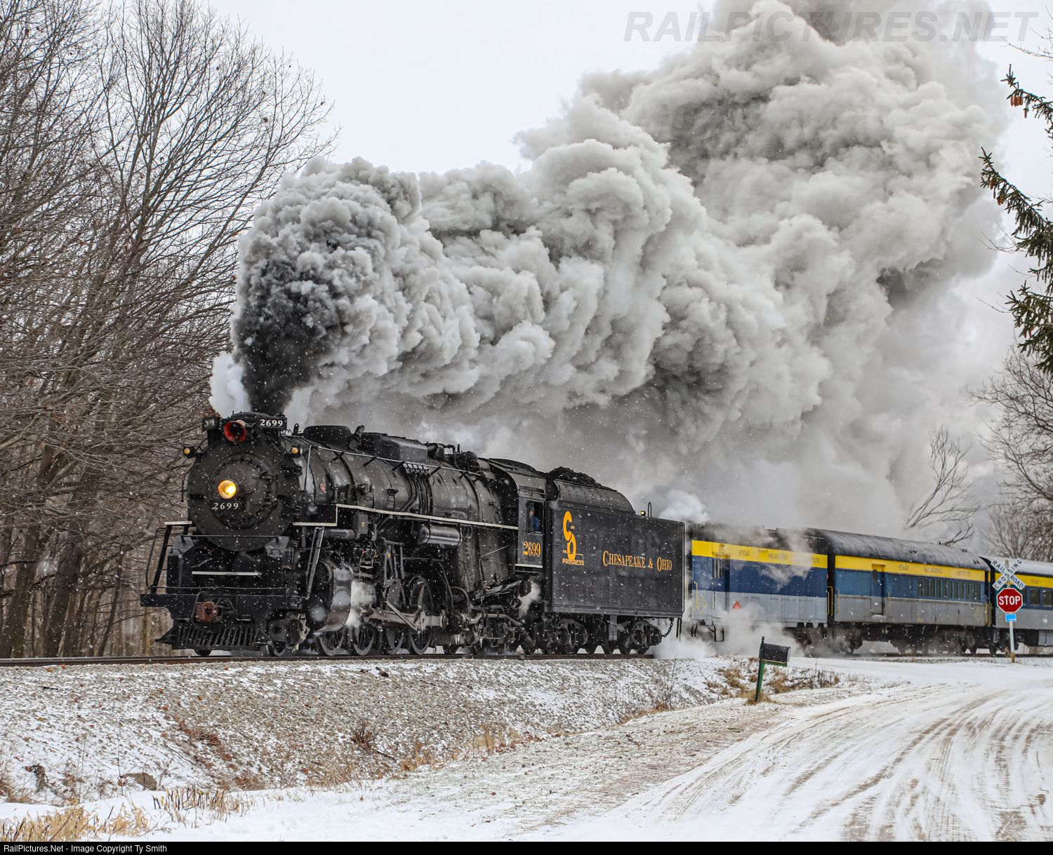 Pere Marquette 1225 masqueraded as Chesapeake and Ohio 2699 performs runby for the Lerro Photography photo charter at King Road in cold and snowy conditions.