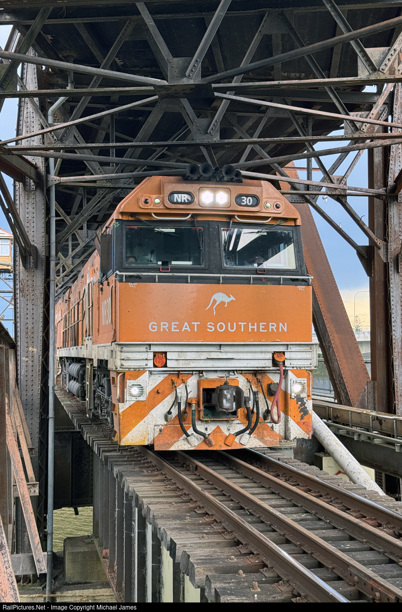 | On a cloudy afternoon, Train 2BT8 ‘Great Southern’ rolls across the road-rail bridge over the Clarence River in Grafton on the North Coast Line for a Crew Change. NR30 and NR31 are owned by Pacific National but painted in a special Great Southern scheme for their 'hook and pull' contract. The Great Southern utilises The Ghan rollingstock during the wet season (December to February) and operates between Adelaide and Brisbane. |