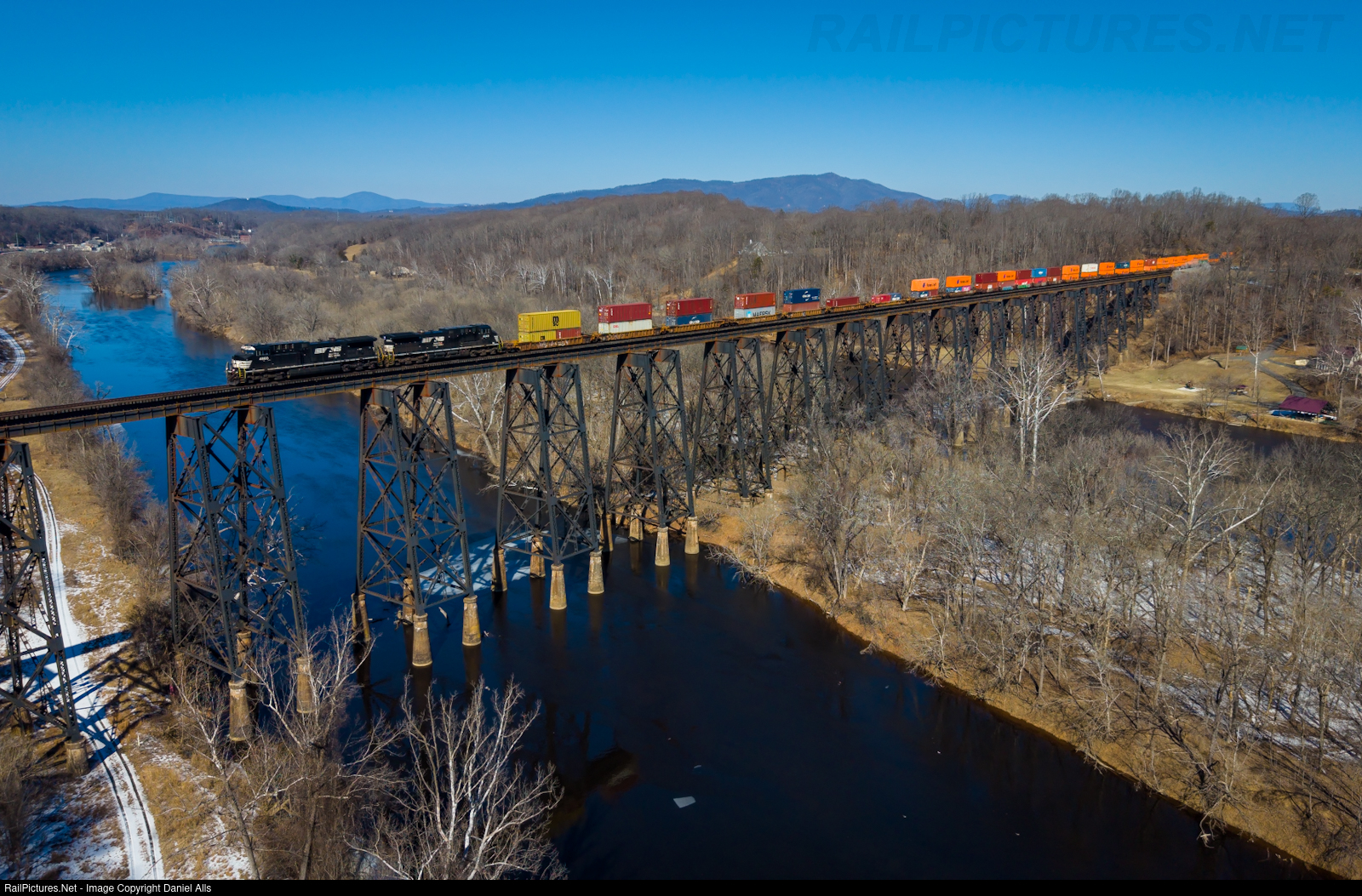 NS 275 soars over the James River Trestle in Lynchburg, VA.
