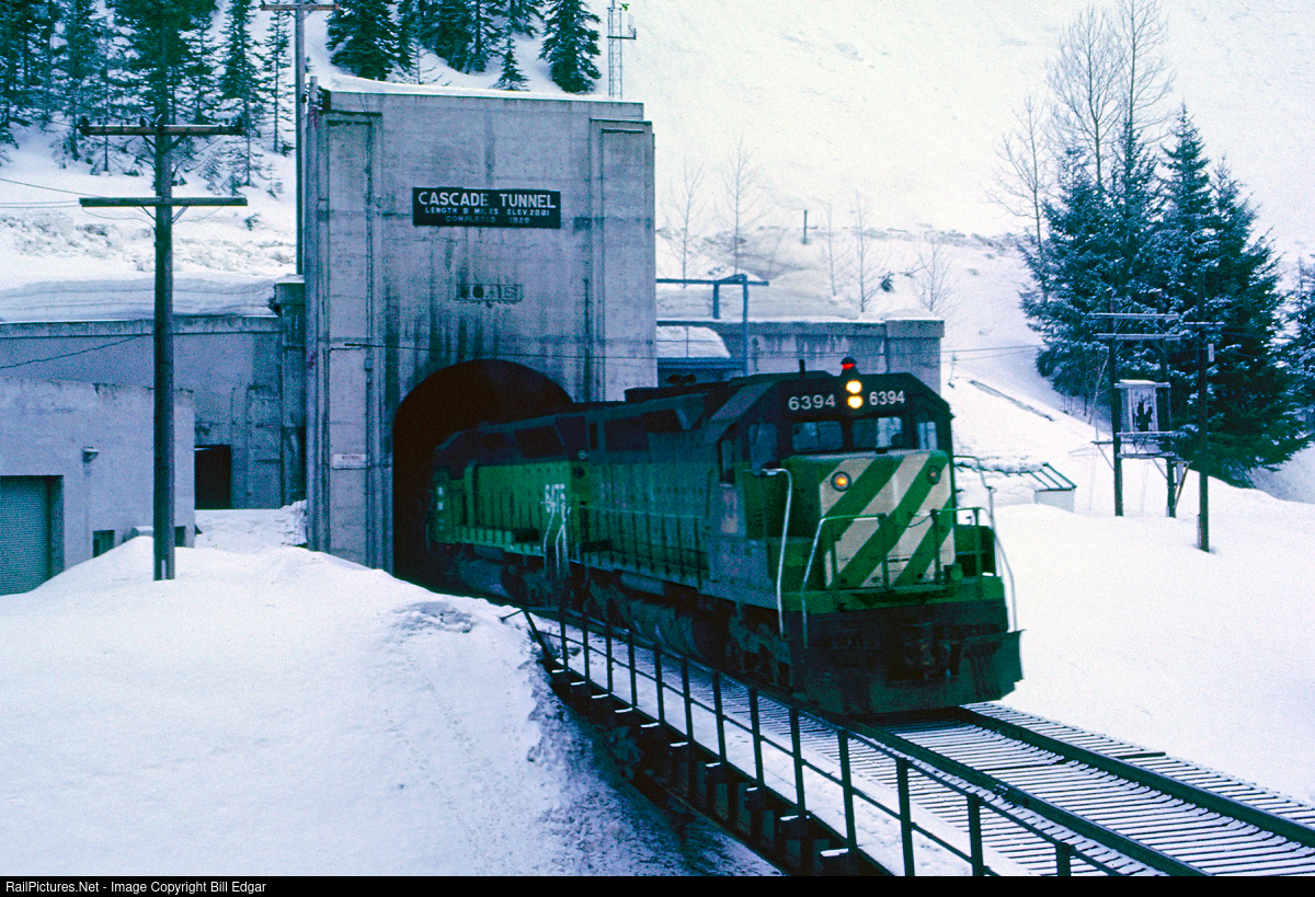 BN 6394, a former GN SDP40, leads an eastbound freight out of the Cascade Tunnel in March 1975. At this time the Cascade Tunnel was the longest in the Western Hemisphere at just under 8 miles in length. After the BN merger in 1970, BN grabbed GN SDP40s and SDP45s out of passenger service and put them in freight service to keep Amtrak from getting them in May 1971.