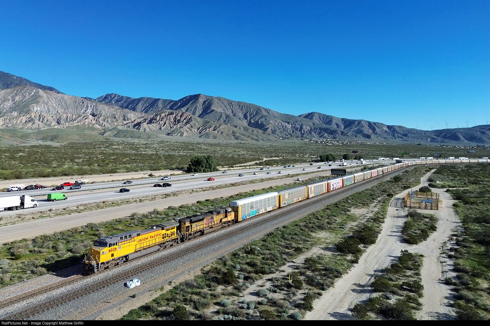 A fresh UP 6026 leads a westbound auto train near Cabazon.