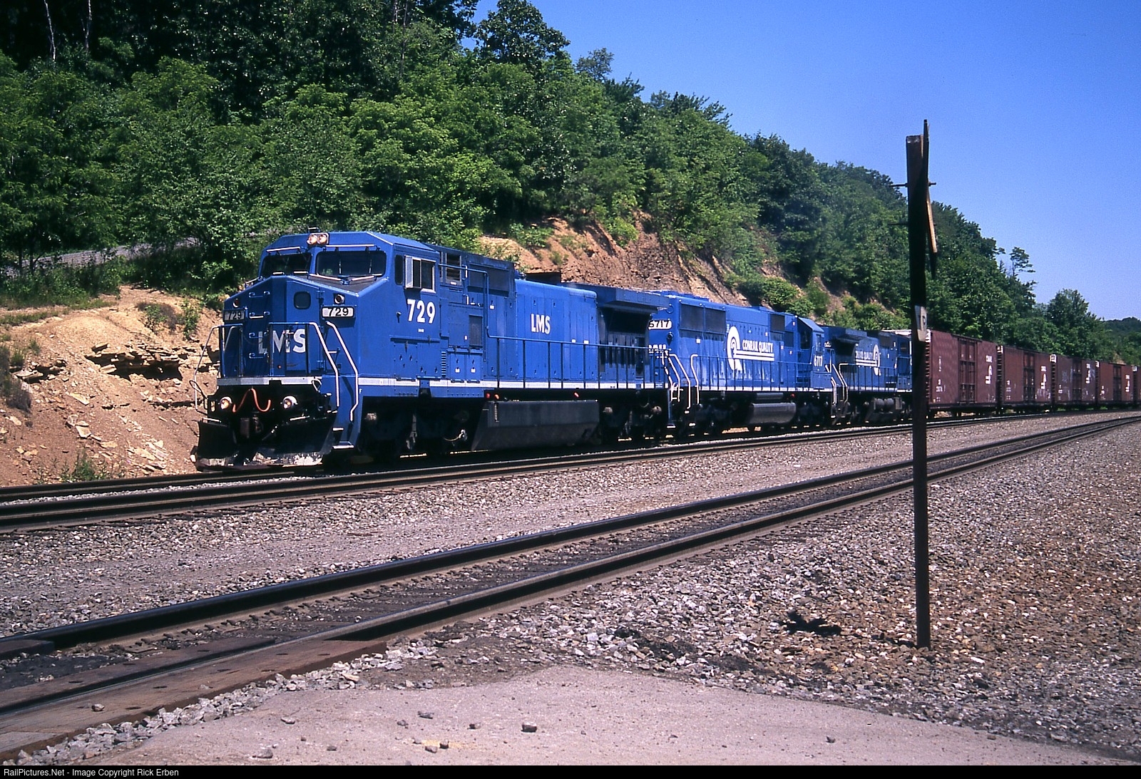 Why they called Conrail “Big Blue” - a couple Dash8-40CWs are spliced by an SD50 leading a westbound manifest out of Altoona, PA at the Brickyard Crossing on an October morning. The symbol is a long-shot run from Camden, NJ to Elkhart, IN (CAEL). While the LMS logo was rather uninspiring, the units were later given the “Conrail Quality” logo. CR was in its prime and had become a pretty lean outfit. It should have remained rather than been broken up. Fuji Velvia.