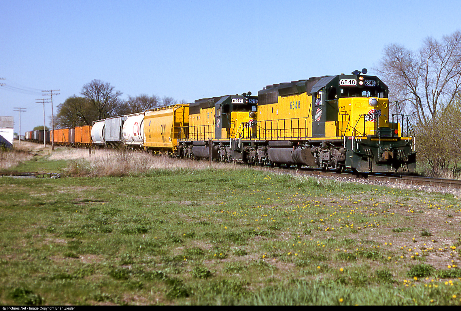 A CNW train heads southward on a springtime afternoon.