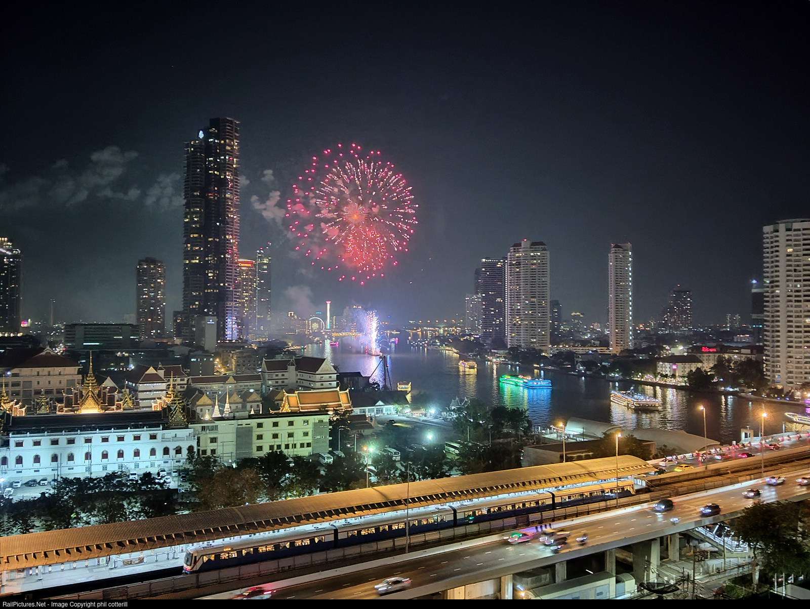A 4 car EMU of Bangkok`s Skytrain (BTS) Silom line calls sat Saphan Taksin station. Meanwhile lucky passengers on illuminated cruise boats on the Chao Phraya river enjoy a fireworks display.