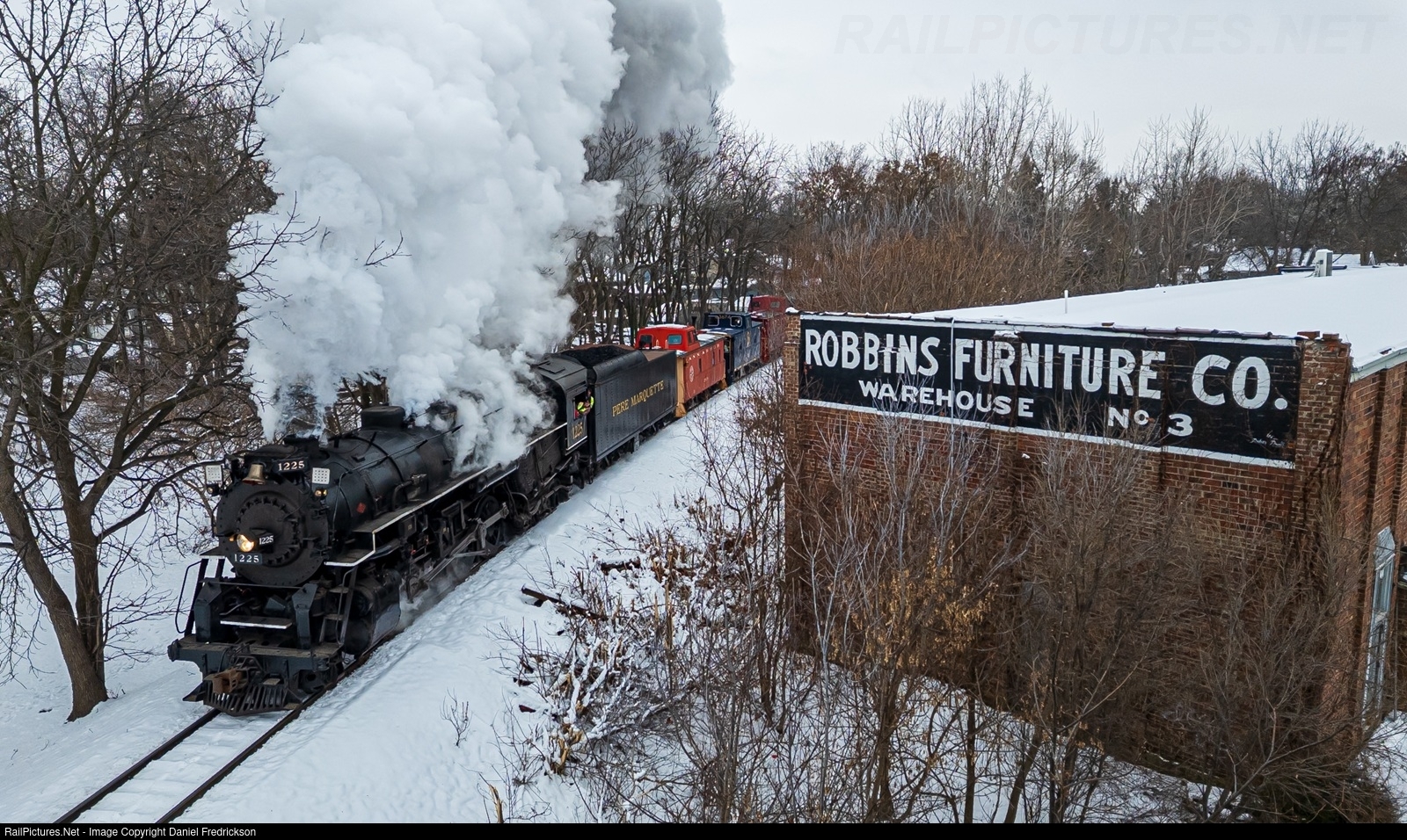 | Pere Marquette 1225 leads the daylight westbound Polar Express for Ashley, MI out of Owosso and past the historic Robbins Furniture building on the west side of town. |