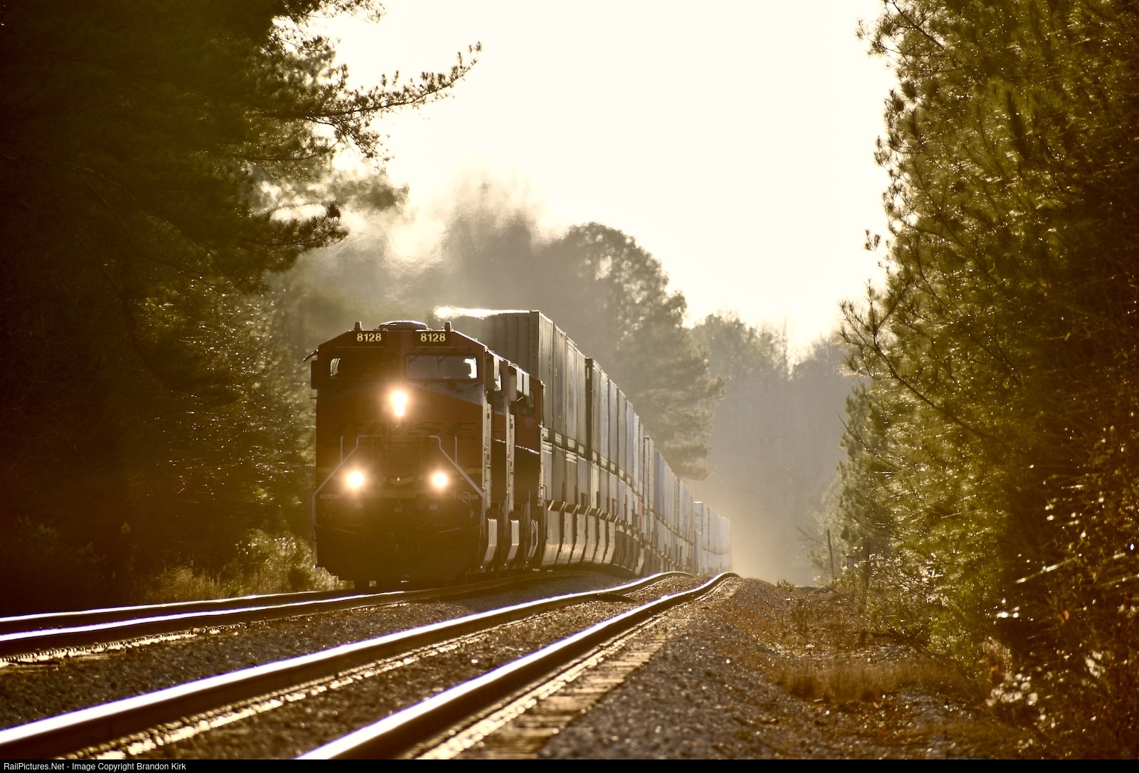 | A double-stack intermodal train races south through Broughton enroute to Fairburn, GA. Golden haze surrounds the BNSF power and 113 cars as they travel over a nearly mile long section of straight track. |