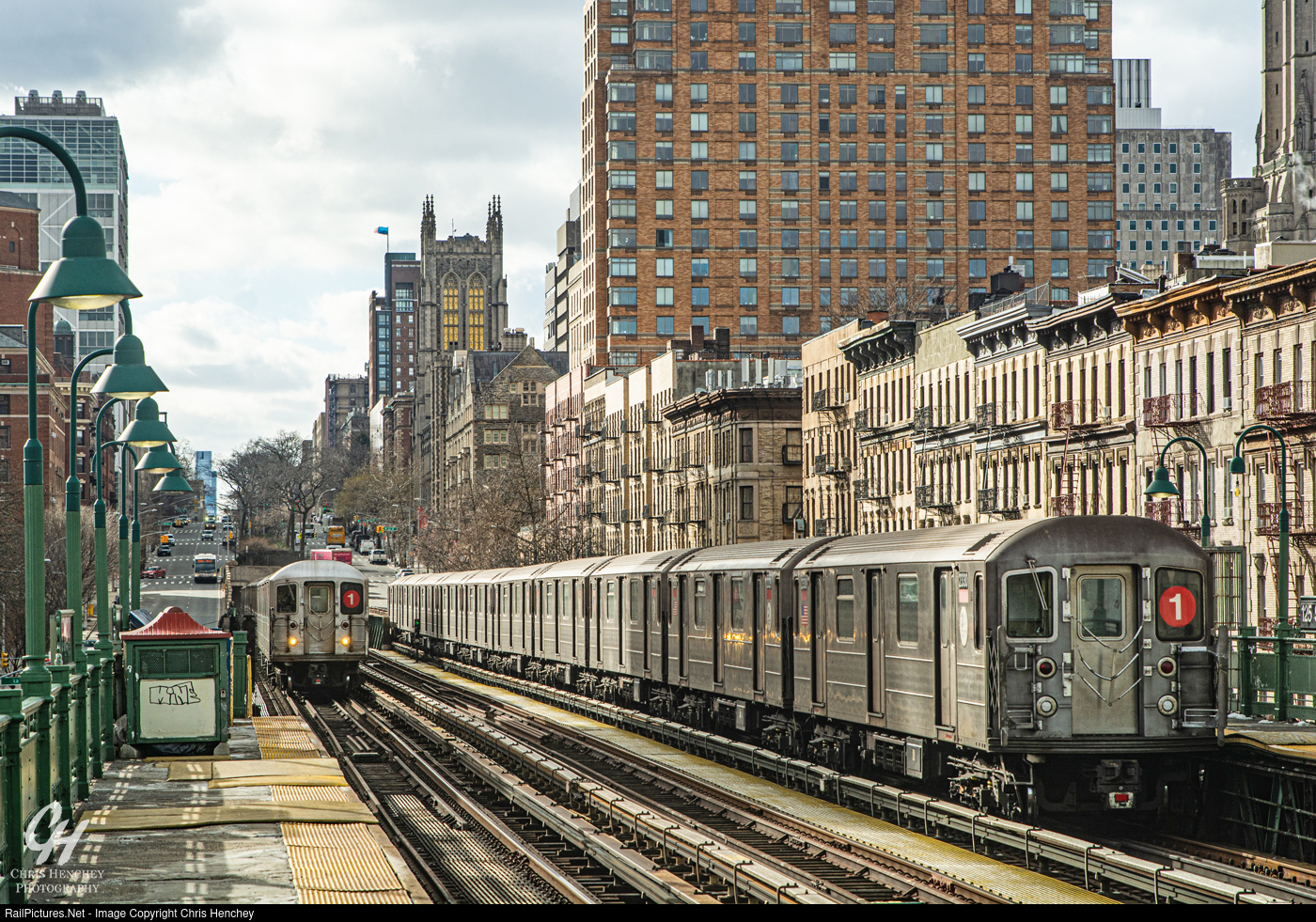 A pair of 1 trains meet just to the south of the elevated 125 Street station in Manhattan's Upper West Side on a blustery December day.