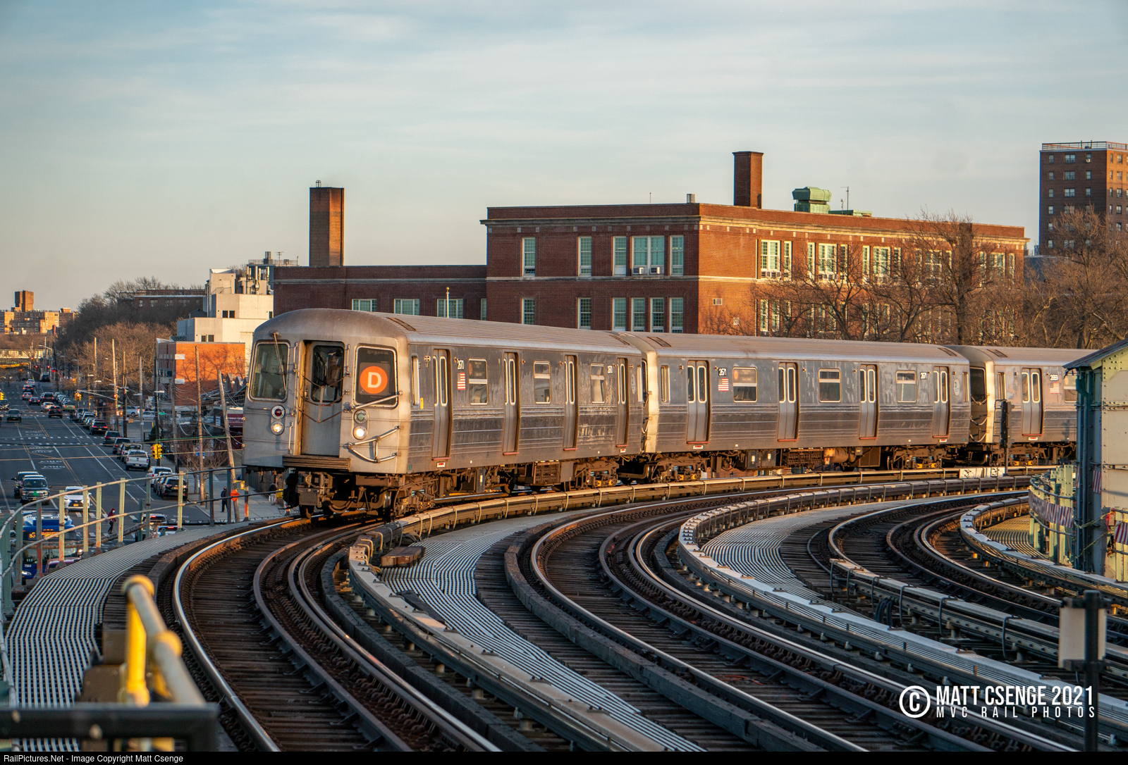 A Manhattan-bound D train rounds the curve at 25th Ave station on the West End Line, with P.S.248, the Transit Learning Center in the background. This R68 set is one of few that have the ends painted in light grey. |