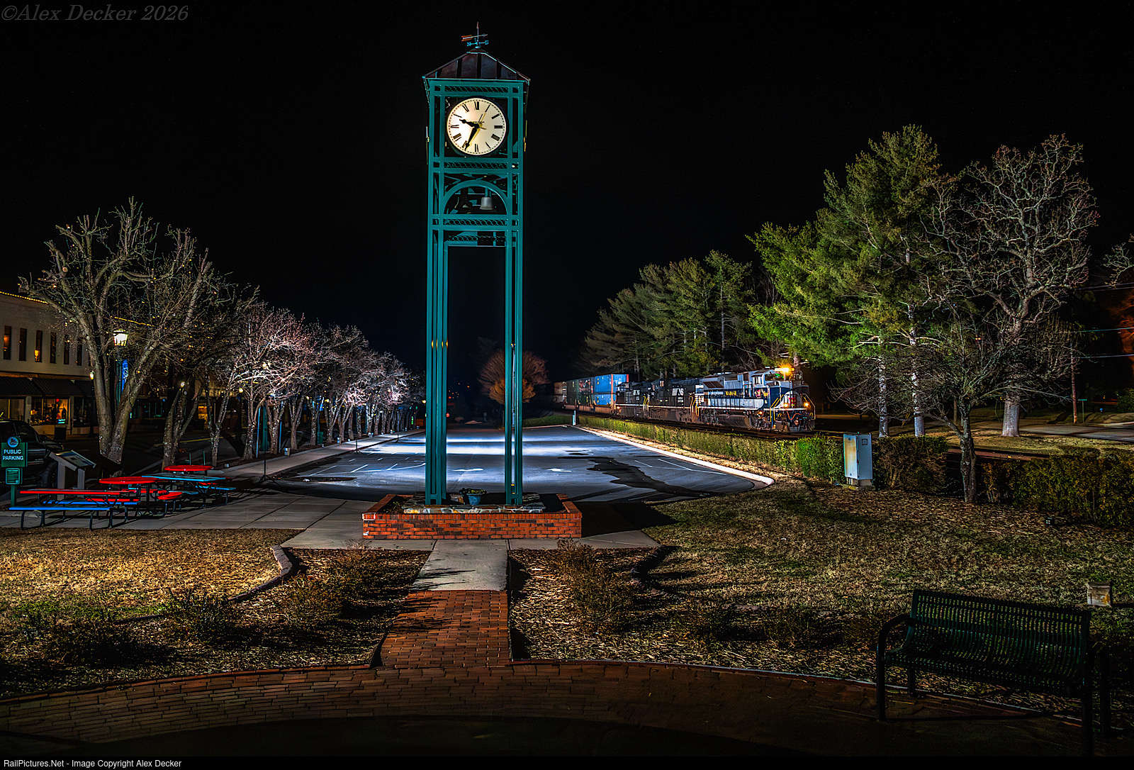 As the town clock ticks away the hours til the end of the day in the small town of Thomasville, Wayne Hege and Jake Highsmith hustle 25A south through the small North Carolina town with the Wabash heritage unit leading the way on the priority UPS train. |