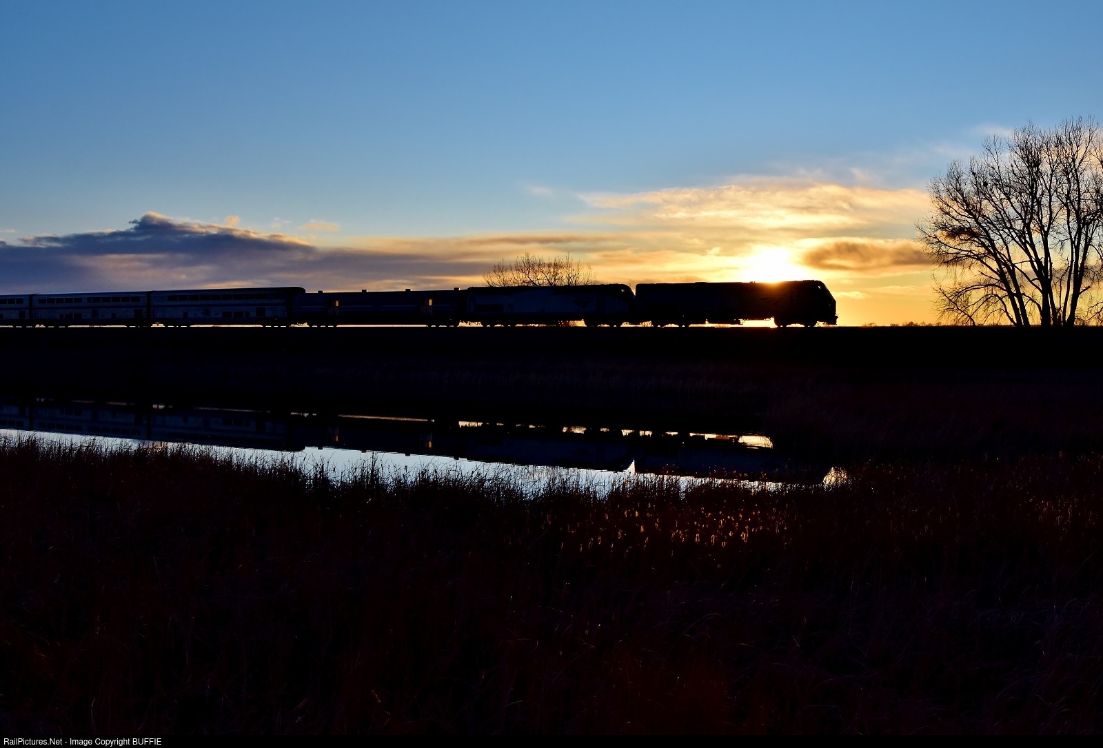 Sunrise catches the California Zephyr as it runs through Barr Lake in Brighton, Colorado.