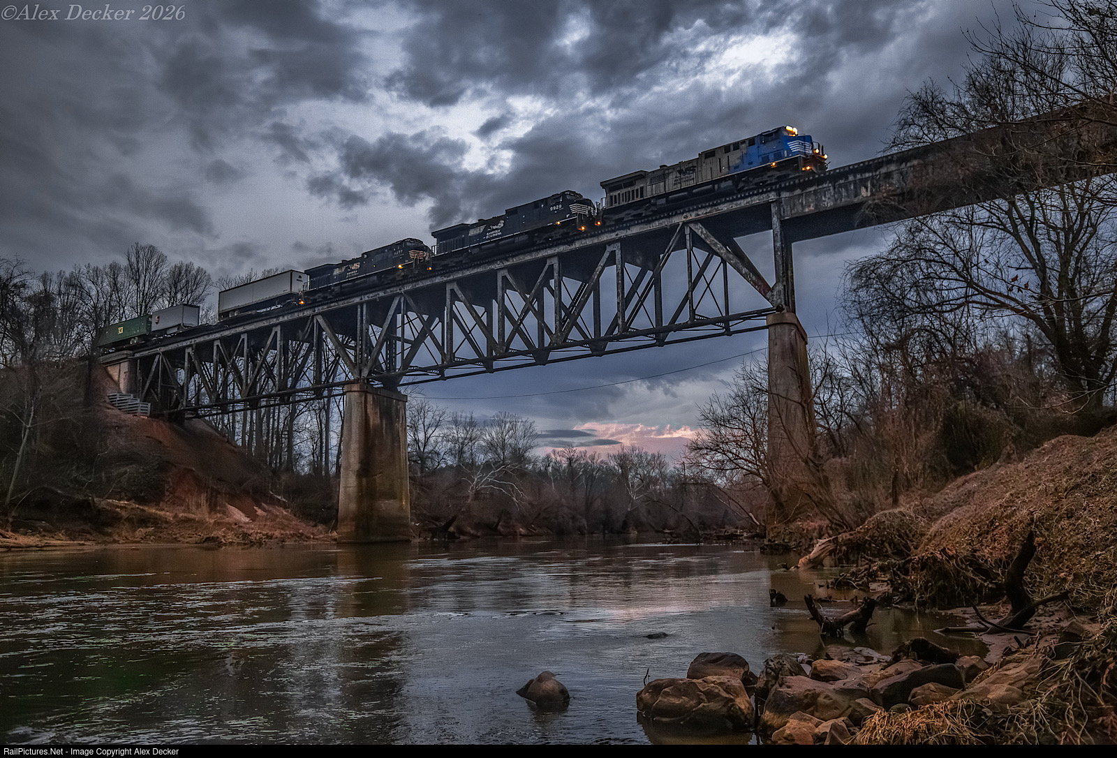 With the sun having set on the banks of the Staunton River, Wayne Hege and company hustle 24X north through Altavista as blue hour creeps in with the first AC44C6M on the point of the UPS laden pig train. |