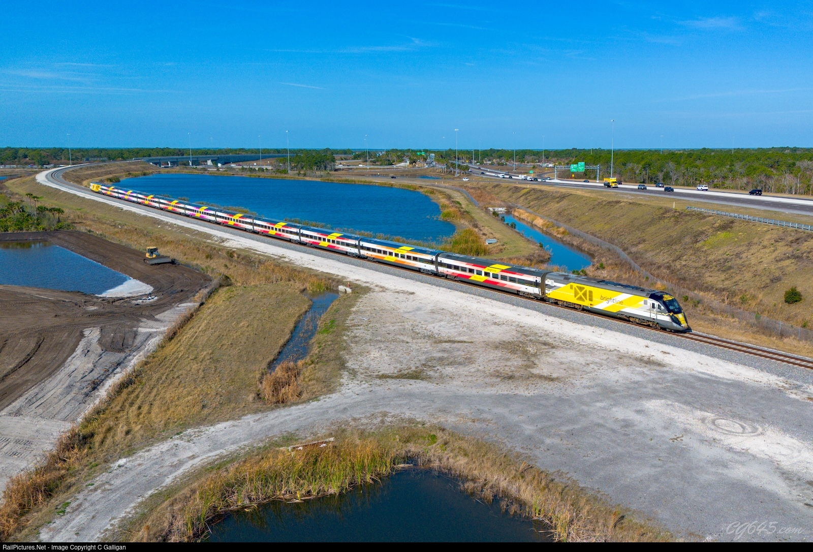 | Brightline Train 5327 (722S) with the Red Set #2 flies around the i95 interchange in Cocoa, FL enroute from Orlando to Miami with a recently expanded 10 car set. |