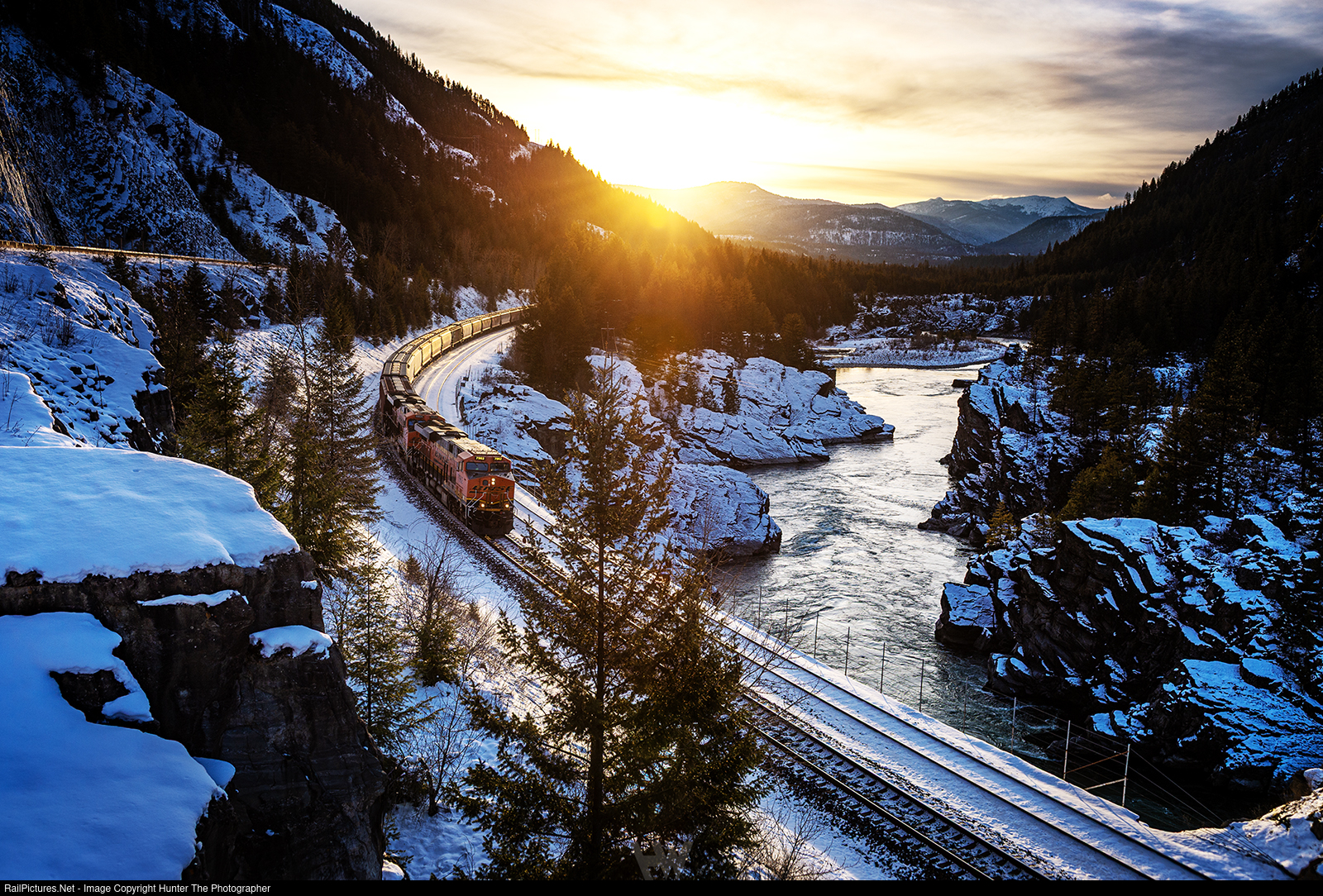 Apricity | With a golden sun just about to set over the mountains, an eastbound train of empty grain hoppers makes its way alongside the Kootenai River on the evening of Saturday, February 21, 2026 at Kootenai Falls, MT.