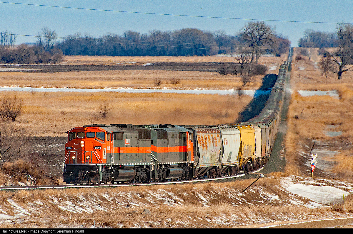 Just west of Cogswell, ND, a pair of ex-CN cowls bring 130+ grain empties west to a crew change at Oakes before continuing on. Crews are based in Oakes, ND and pick up grain traffic from the CPKC at Hankinson.