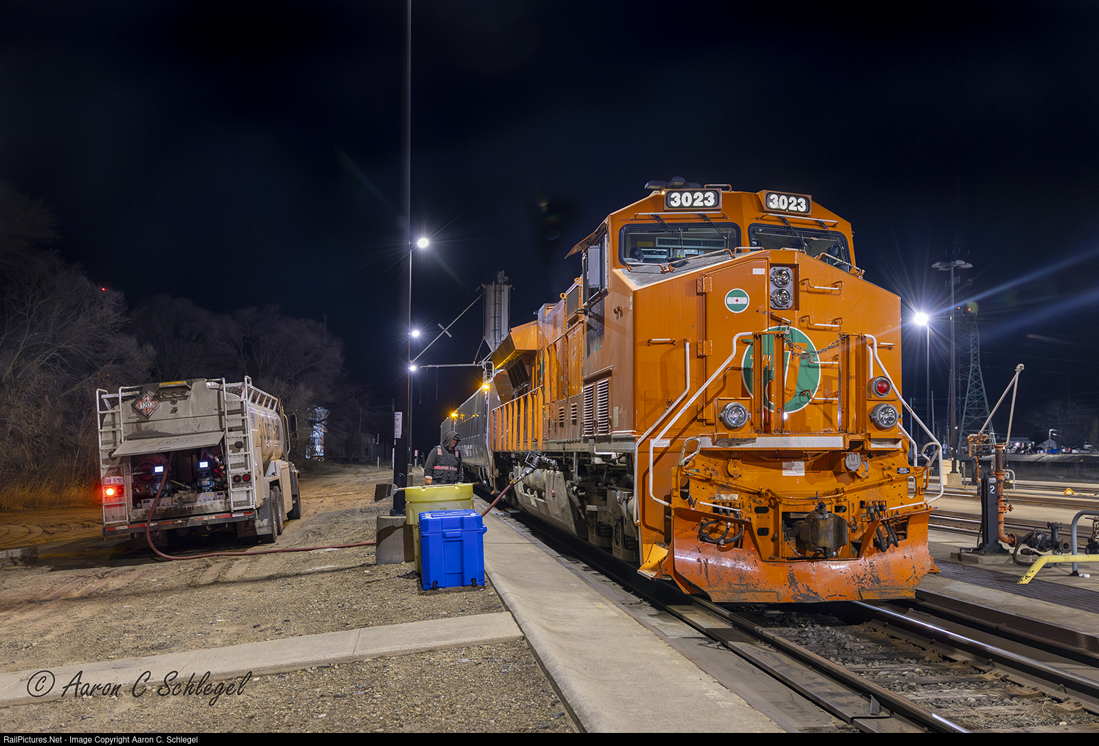 | Siemens Special back to California from Montreal. The CN 3023 heads up an L325 to transport two Venture Coaches back to the Manufacturer after testing in Canada. The train gets fuel in Battle Creek along the way. A Crystal Flash truck fills the 3023 for the trip West. |