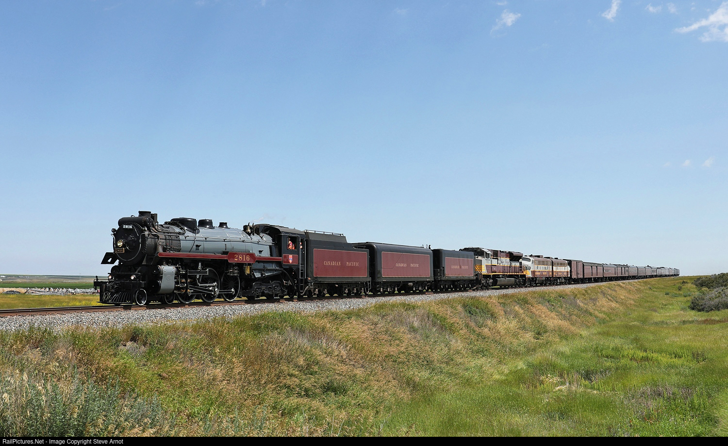 | CP 2816 heads west on the Swift Current Sub as it proceeds from Moose Jaw, SK to Dunmore, AB on the second last day of the Final Spike Tour. |