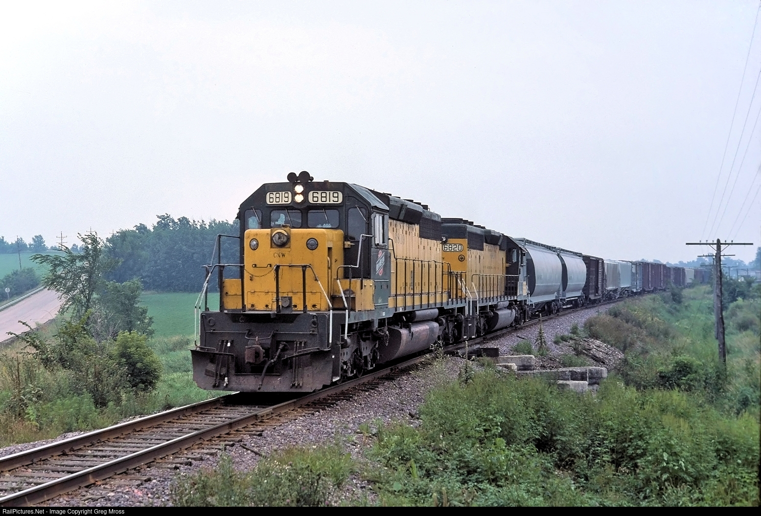 CNW 6819 is about to cross Hwy V just north of Campbellsport, WI. with train PRANA in August of 1989. The train is operating on the newly formed Fox River Valley Railroad, previously CNW's Airline. This portion of the line has been ripped up and is now part of the Eisenbahn State Trail between West Bend and Eden.