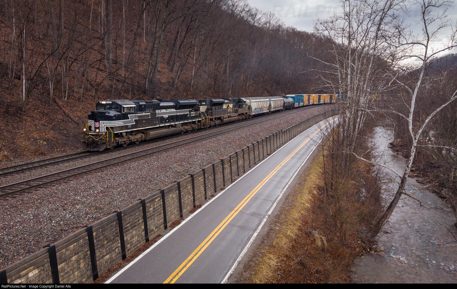 A very clean NYC heritage unit leads NS 119 westbound through Oakvale, WVA above Ingleside Road.