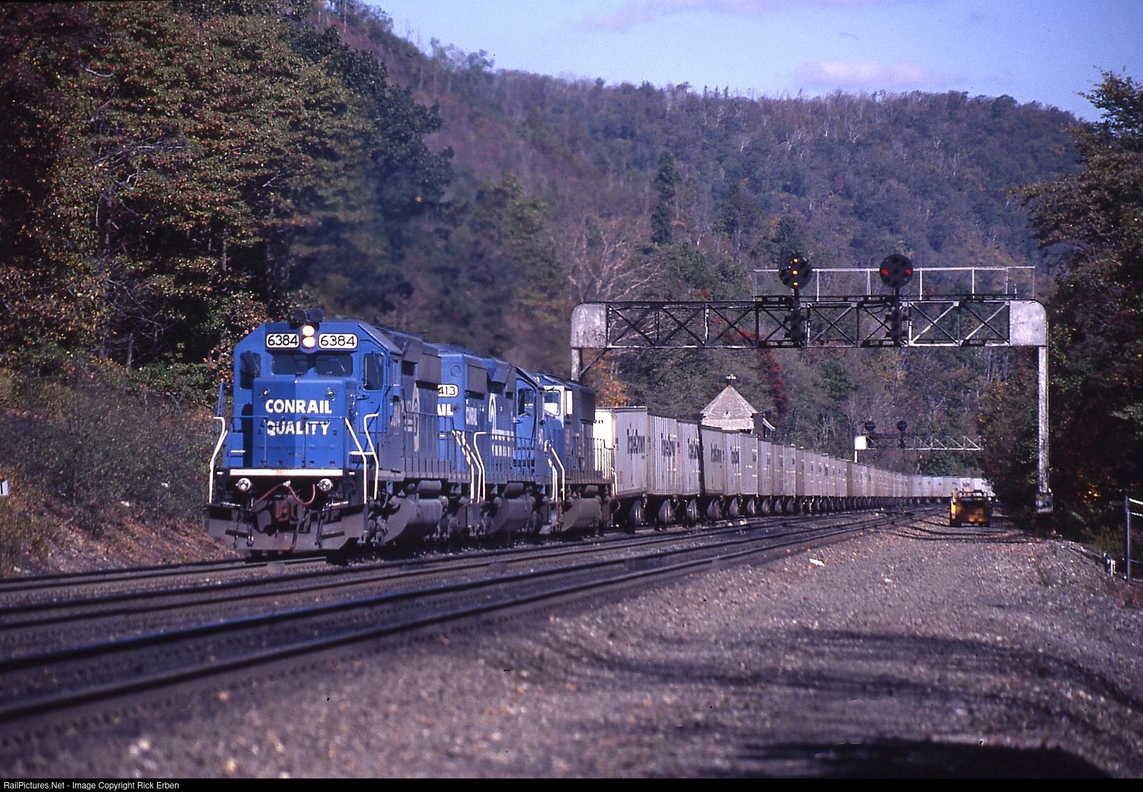 A pair of helpers, or snappers, are coupled ahead of the SD60I road power on RR-261 - a westbound roadrailer with 57 trailers mounted on bogies. The train is moving up the 1.8% grade on the east slope of the mountain through MG interlocking. Ektachrome.