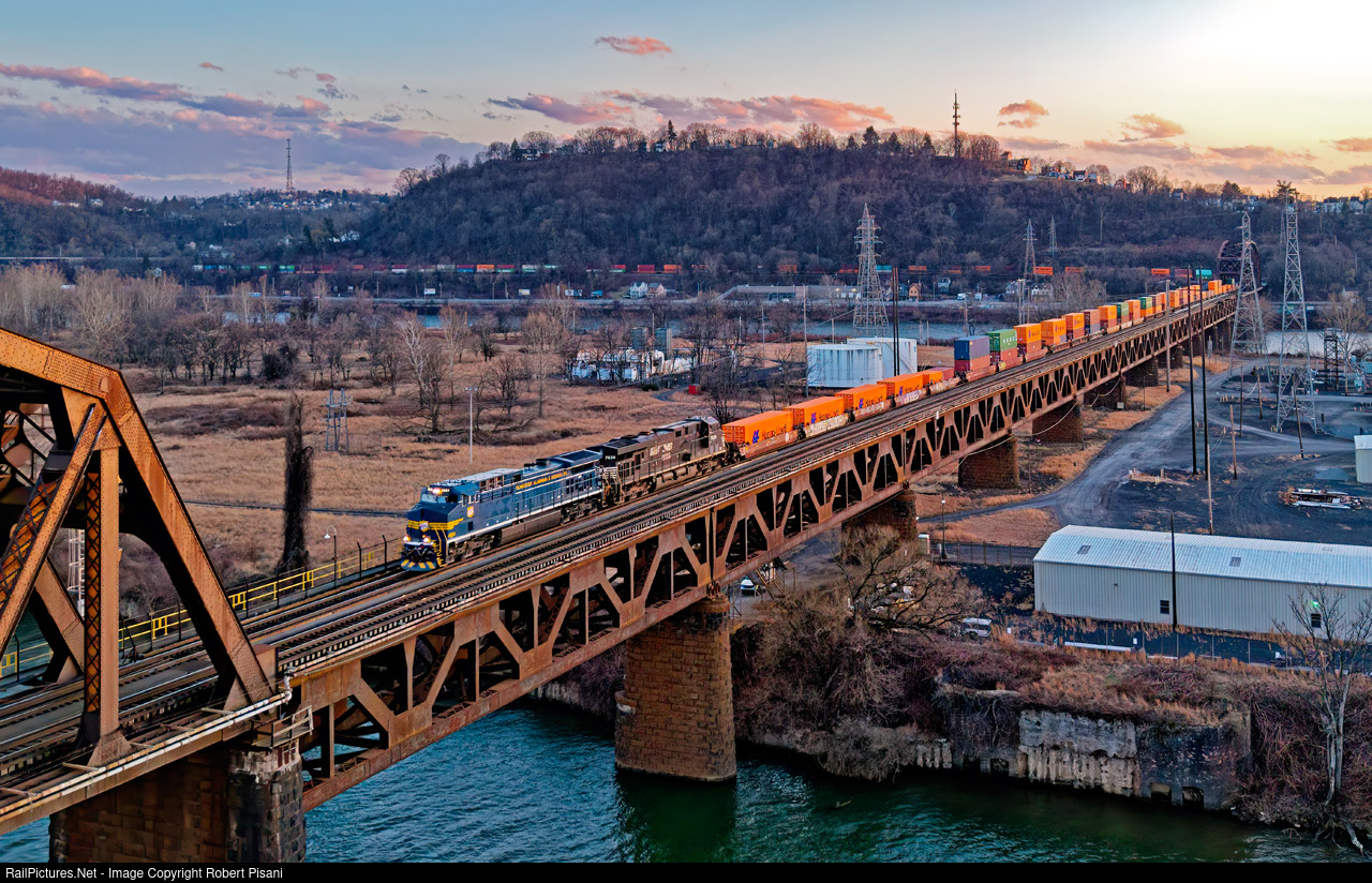 With only moments of daylight left to spare, the Tennessee Alabama & Georgia heritage unit leads NS I69 across the massive Ohio Connecting Bridge in Pittsburgh, PA. Thanks to a late tip I learned this unit was in the area and figured the OC Bridge offered the best chance of catching some usable daylight as the sun was setting behind the hills to the west. I69 (eye-six-nine) was an extra section of 269 which operated between Port Newark, NJ and Chicago, IL. The TAG unit would pass through Pittsburgh again 28 or so hours later under the cover of darkness leading an I68 headed right back to New Jersey.