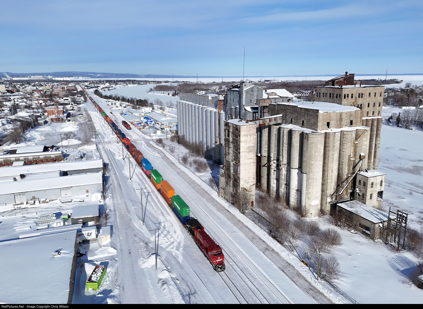 Westbound intermodal passes the abandoned pool 8 complex across from CPKC's Thunder Bay "Westfort" depot/station.