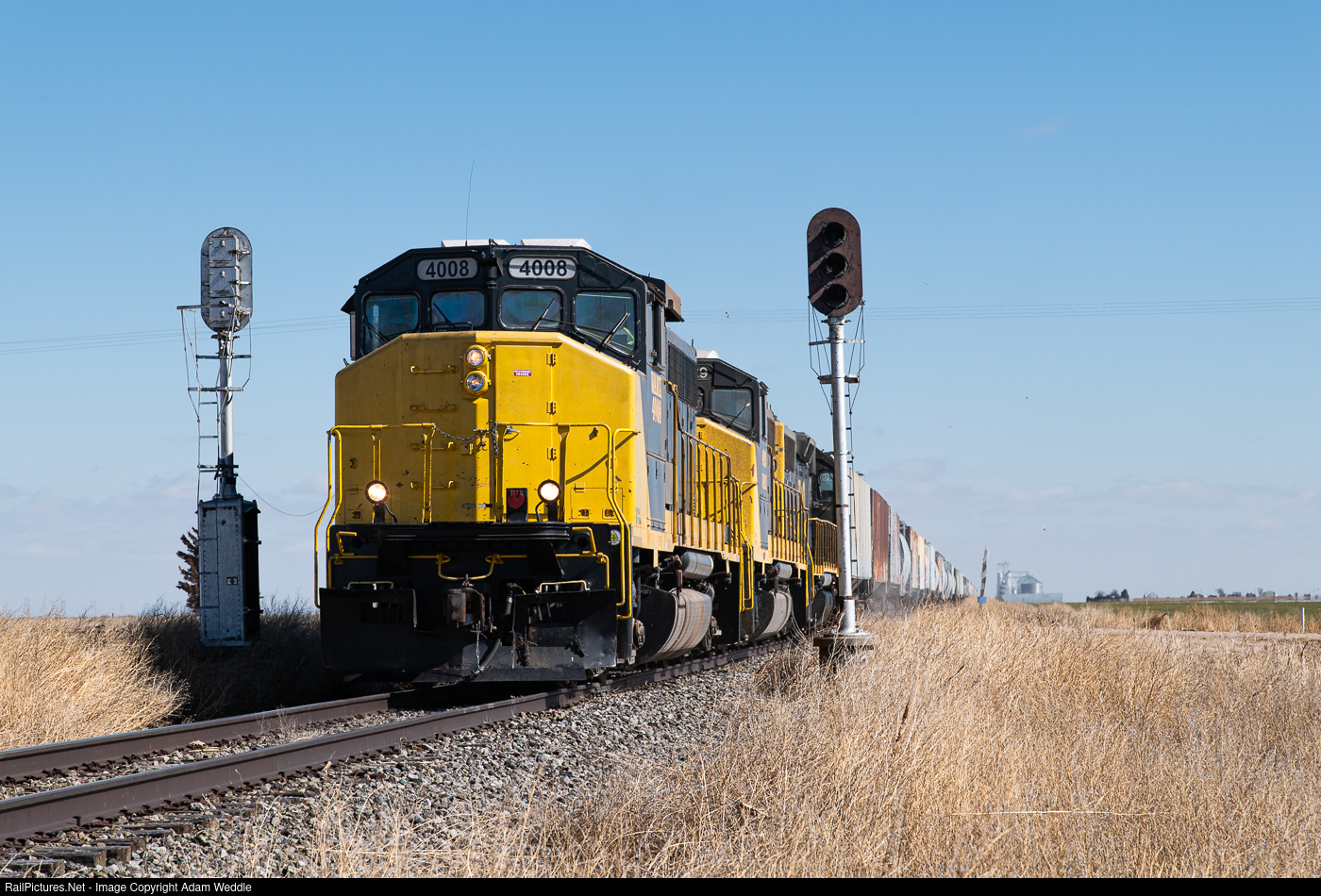 WAMX 4008 slowly makes its way across the Scott City Subdivision. They're passing a set of decommissioned signals just West of Modoc.