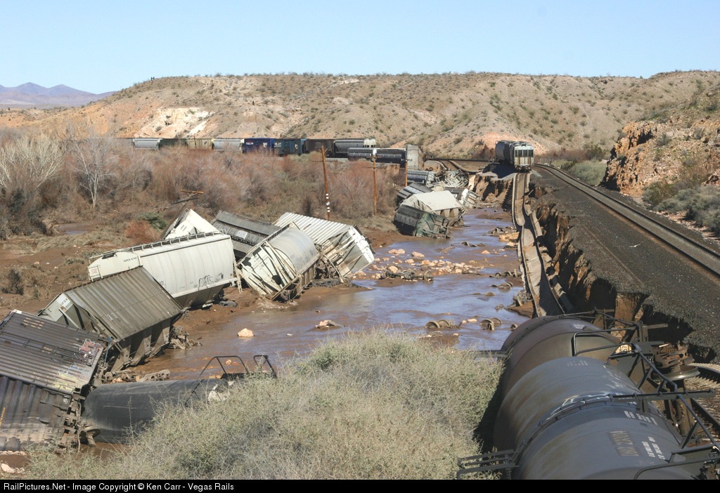 Derailment of a eastbound manifest from Yermo to Salt Lake City due to heavy rain over the past week. Taken from atop the foundation of the old water tower, which the tank car is leaning against.