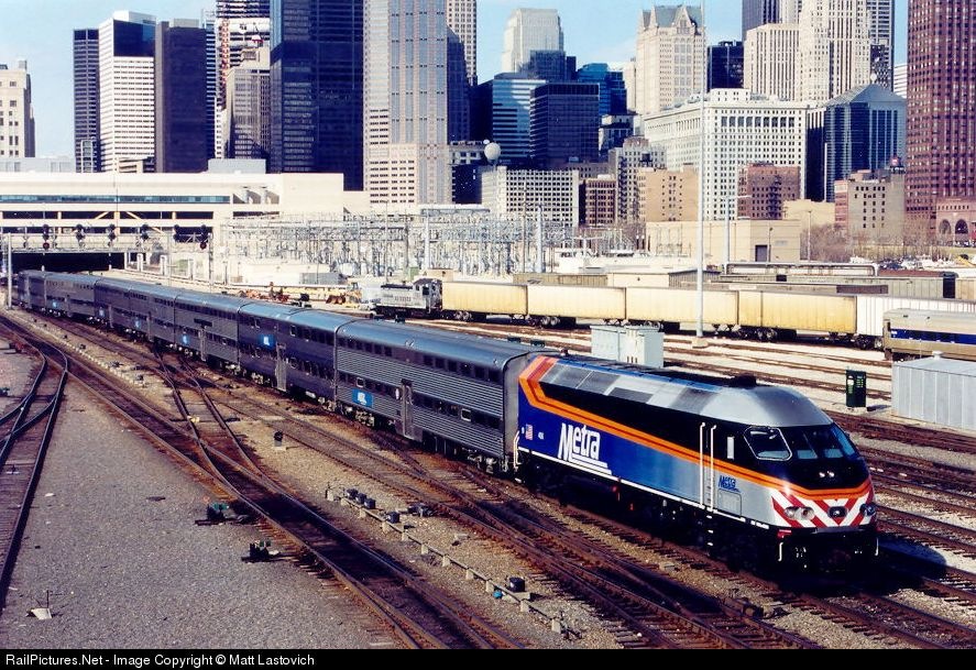 | Metra departs Chicago Union Station making its way toward the BNSF's Chicago Sub for a trip out to Aurora, as an Amtrak SW1200R shuffles around some roadrailers. |