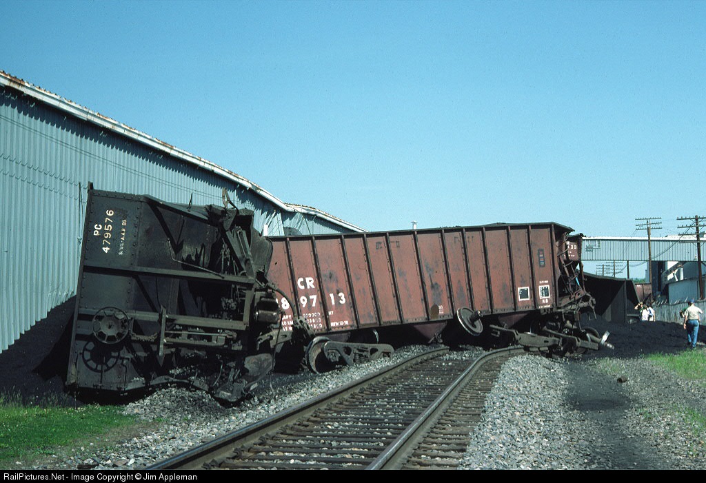 19 loaded coal hoppers derailed. Building is the former Zenith Corp. Warehouse. Only hopper car with friction bearings in train caused derailment.