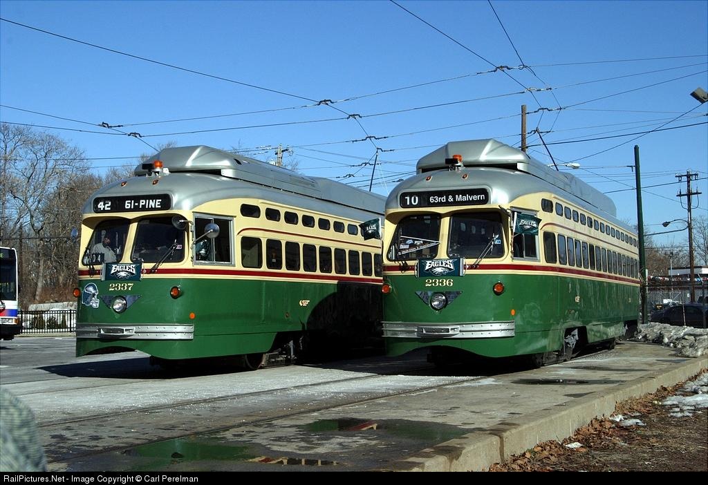 | SEPTA PCC-II 2336 and 2337 are decorated for the Philadelphia Eagles in support for the home team at the upcoming Super Bowl. The PCCs operated over various West Philadelphia streetcar lines as part of a Wilmington Chapter NRHS fantrip. |