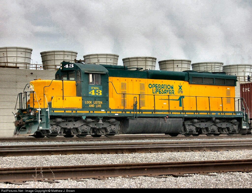 | PHL 43, a SD18, doing some switching. This was built as a Southern Railway high-nosed SD24 and was later owned by the CNW, hence the paint. |