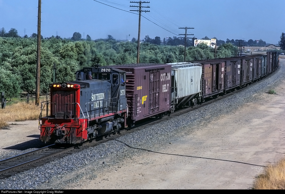 | The conductor of Southern Pacific's "Madera Flyer" (the Madera Local) gives a friendly wave as the train passes a grove of olive trees behind a "Crud" as it heads north (railroad west) out of Fresno, California. SP owned 240 SW1500 locomotives, such as SP 2670, designed by EMD as switchers but used by SP for everything from yard power to locals (such as this) to mainline consists! |