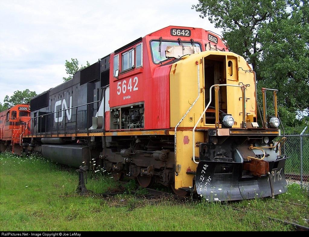 | 5642 has still not been sent back to CN 6 months after it was in a pulpwood truck accident: http://www.railpictures.net/viewphoto.php?id=54828. The front has been rebuilt and new ditch lights, plow, and shocks have been added. |