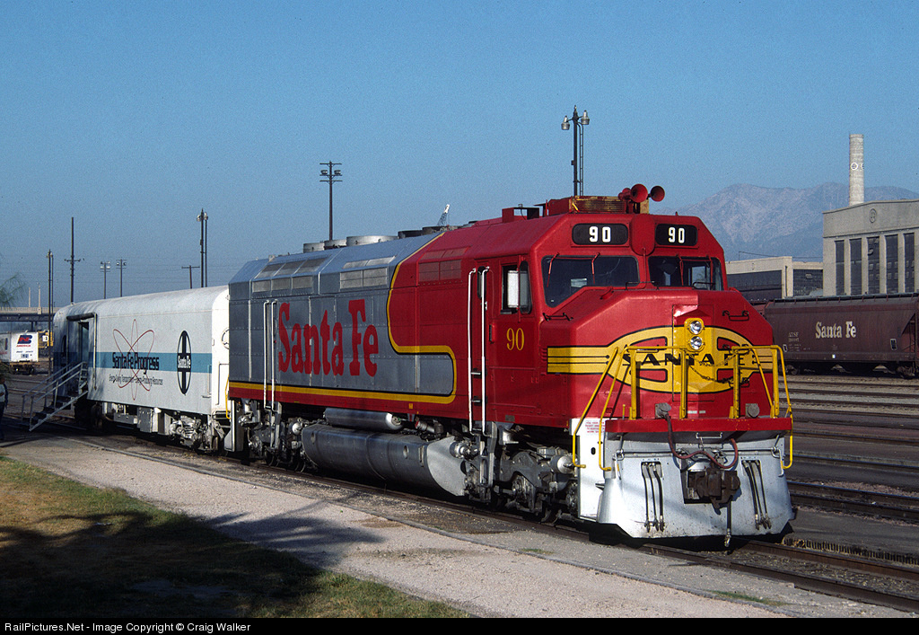| Santa Fe FP45 90 (ex-5990, ex-100, ex-5990, ex-5940, nee-100) sits with the railroad's display car at the San Bernardino station on October 27, 1990. |