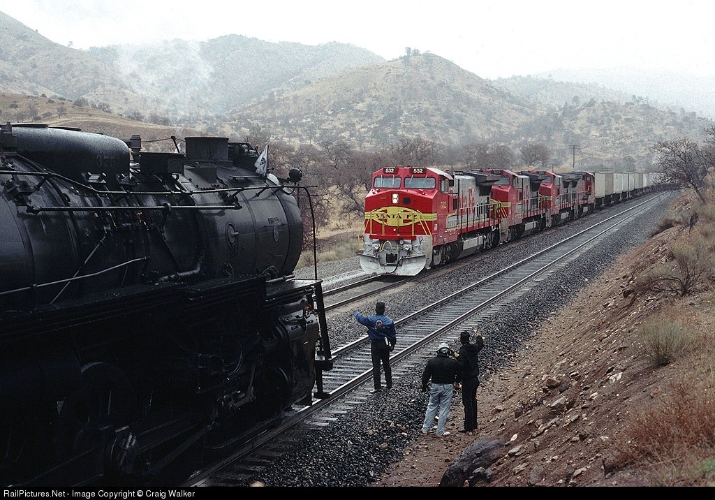 In late December 1991, newly restored Santa Fe 4-8-4 3751 operated on a four-day fan trip from Los Angeles to Bakersfield. This trip included crossing Cajon Pass and Tehachapi twice. On the third day, December 29, the train crossed eastbound over the Tehachapi Mountains on a drizzly day. At Woodford, the excursion met a westbound Santa Fe hotshot, train 991, descending the hill. The steam engine, of course, waited in the siding while the piggyback train, led by ATSF Dash 8-40BW 532, passed by. Some of the Santa Fe employees piloting the special (because the steam engine's crew wasn't familiar with this line) give the freight a roll-by, making sure everything on the train is as it should be. Once the freight clears the siding, the 1927-built Baldwin steamer will continue its uphill trek with a thunderous show of steam and smoke, as it loudly barks its way up the hill and toward the famed Tehachapi Loop, about three miles ahead. Click HERE to see another view.