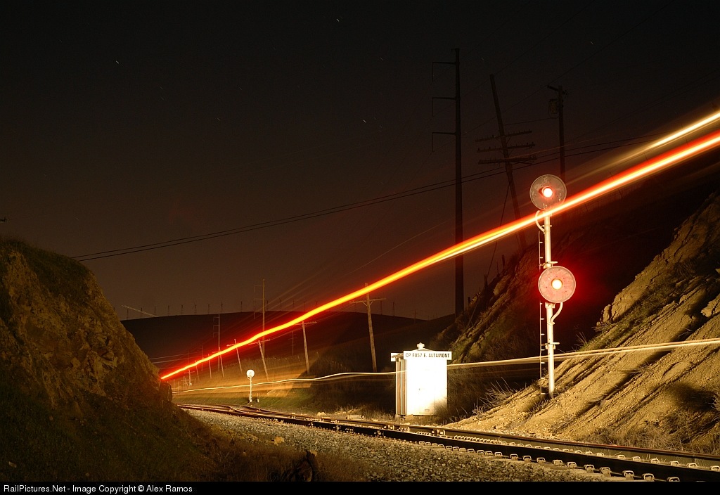 | The steady red light on WP caboose 484 can be seen as it reaches the summit of Altamont Pass and brings up the rear of a 4 car train with 3 WP locomotives at the lead. This was the first time in a long time that WP power ran over AP. Nikon D200, 18-70mm |