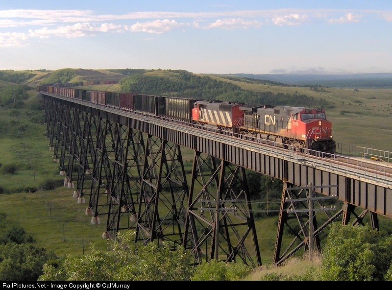 Dash-9 and SD50F slides across the trestle at Uno Manitoba population 20 people