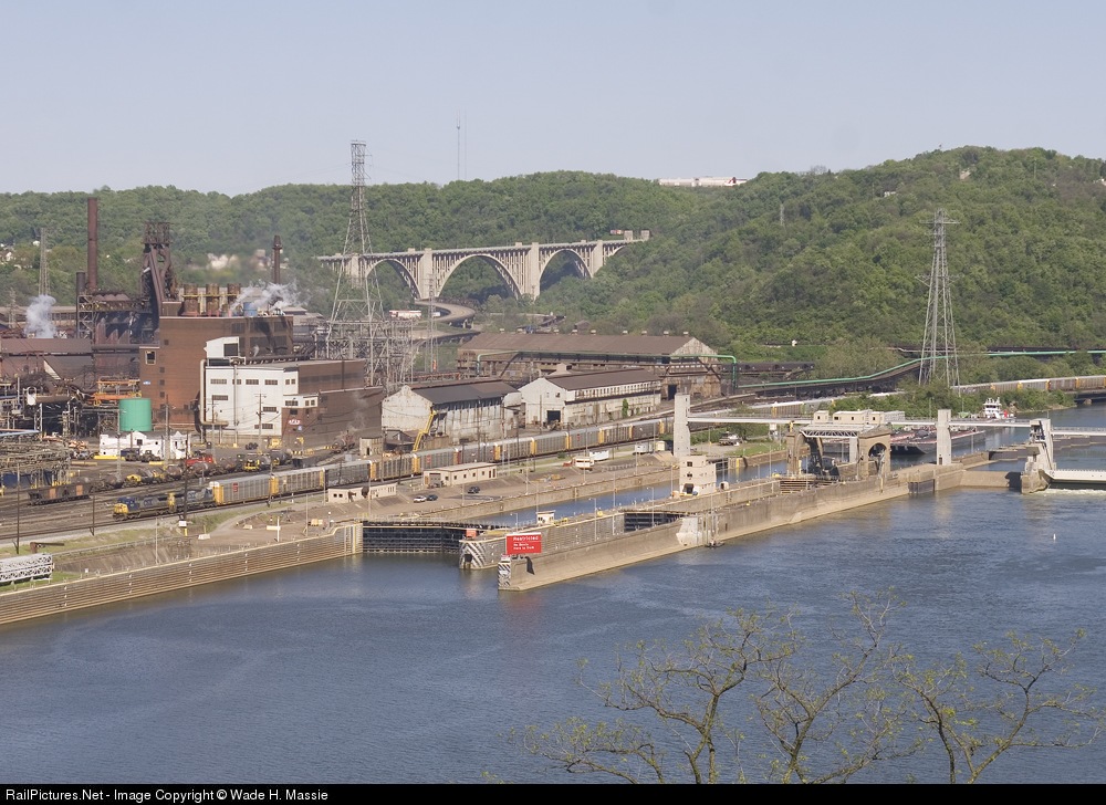 | Several Mon Valley landmarks are visible in this scene - the USX ET plant, the Westinghouse Bridge, and the Monongahela River. |