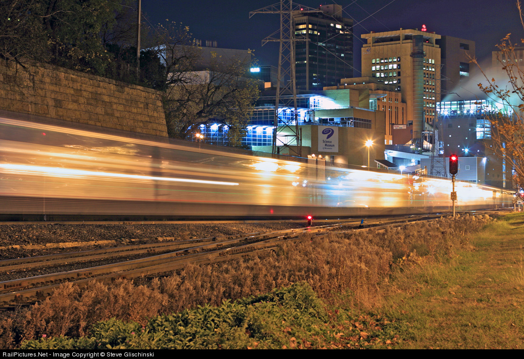 Amtrak's westbound Empire Builder streaks by the downtown St. Paul skyline.