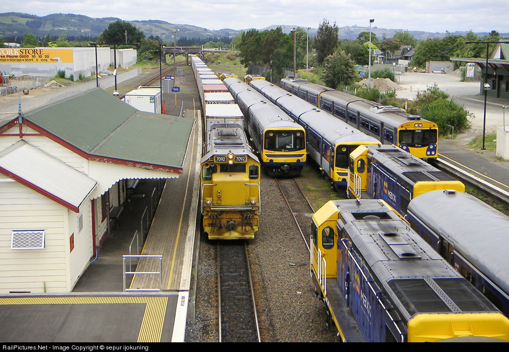 | Freight Train crossing Papakura Station through DMUs and Push-Pull units stabled, Auckland, New Zealand |