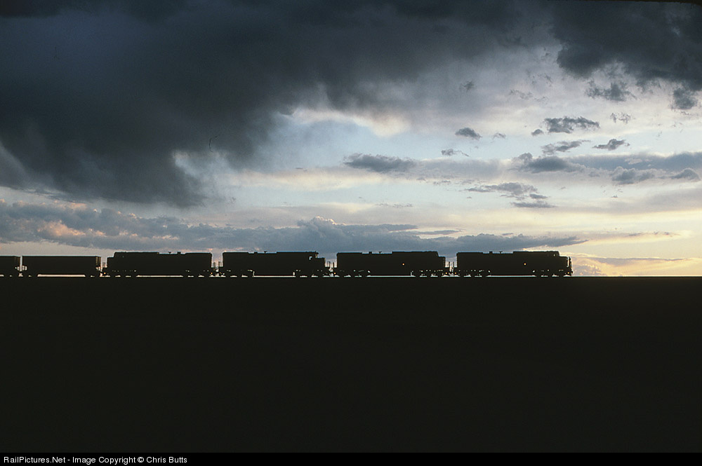 A northbound CNW empty coal train at sunset in the Powder River Basin.