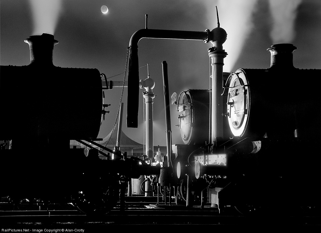 The moon rises in the background as three ex Great Western Railway steamers gather around the water columns at Didcot shed. Since I have been asked a few questions, some notes: The Moon is real, not put in; The shot is a digital monochrome, not darkroom, the reasons for making it monochrome were that it has a better feel and the background was lit by orange sodium lamps.