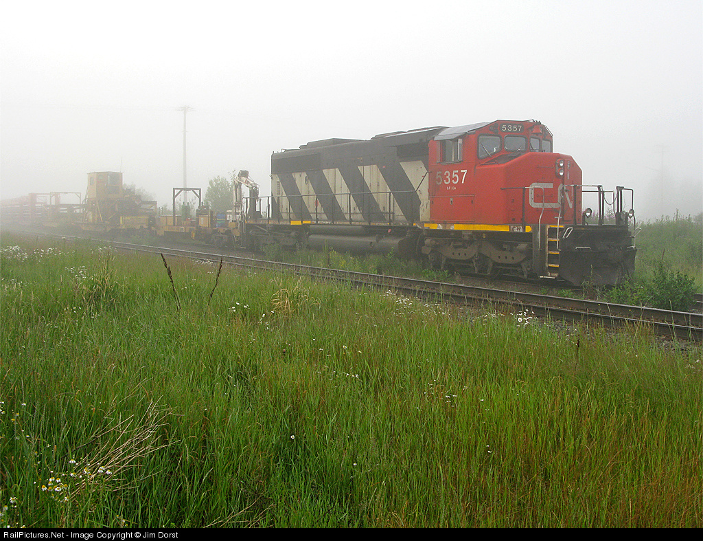 CN 913 work train sits dead on spur track waiting for crew on a foggy mid-summer morning.