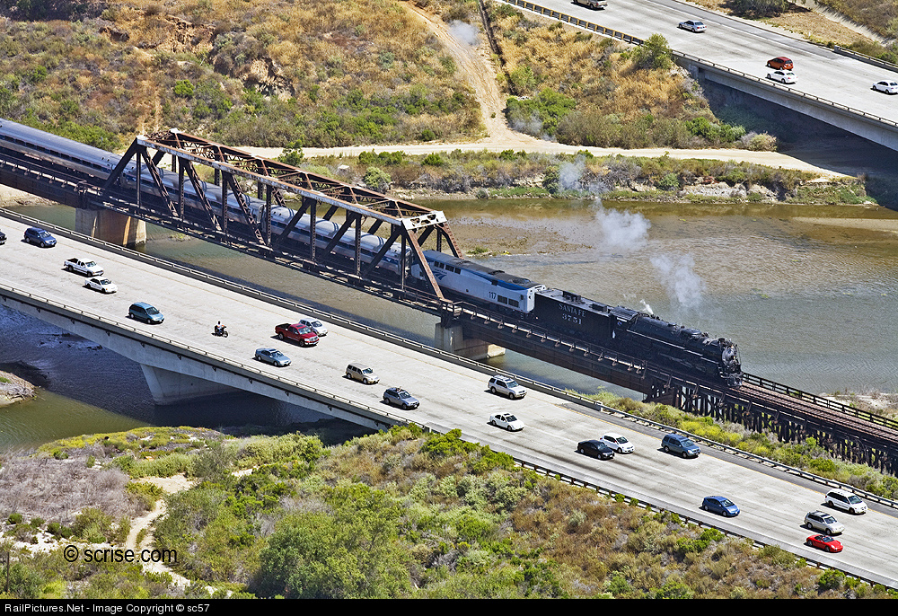 | Sandwiched in between the north and south bound lanes of Interstate 5 is the bridge that crosses the Santa Margarita River. This location is just south of Stuart Mesa Yard between CP Puller and CP West Brook. If you look closely you can see a couple of fan’s pacing the train in the southbound lanes of I-5. June 1st, 2008. San Diego Steam Special sponsored by The Central Coast Railway Club and The Pacific Locomotive Association. www.© scrise.com |