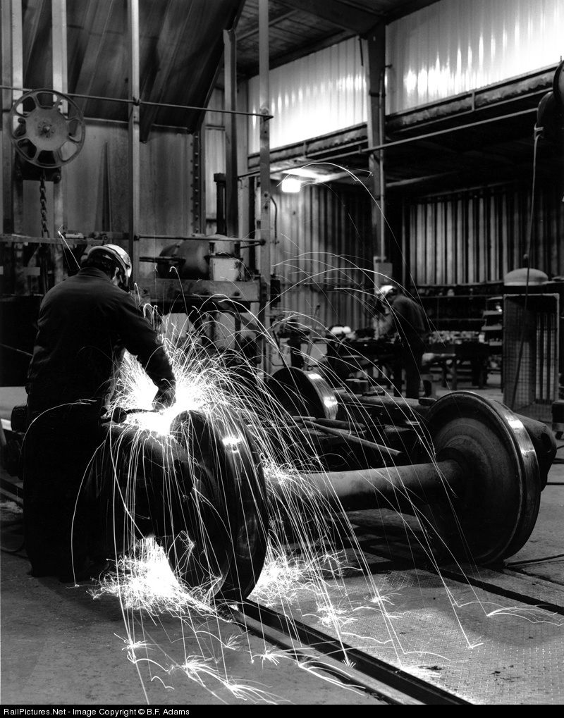 A worker welds on the trucks of Southern "Big John" hopper on a cold winter night about 1:00 in the morning.