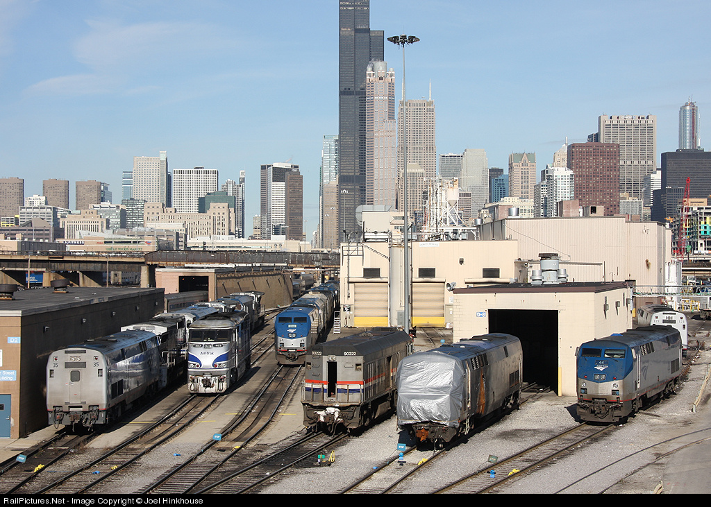 A beautiful day on the 18th street bridge. Five Amtrak schemes (Phases III, IV, and V, Surfliner, and Cascade tucked away) are visible ... not to mention a Metra F40PH. Severely damaged AMTK 7 is still getting pushed around the facility, apparently at random, ostensibly until Amtrak gets funding to make a major repair.