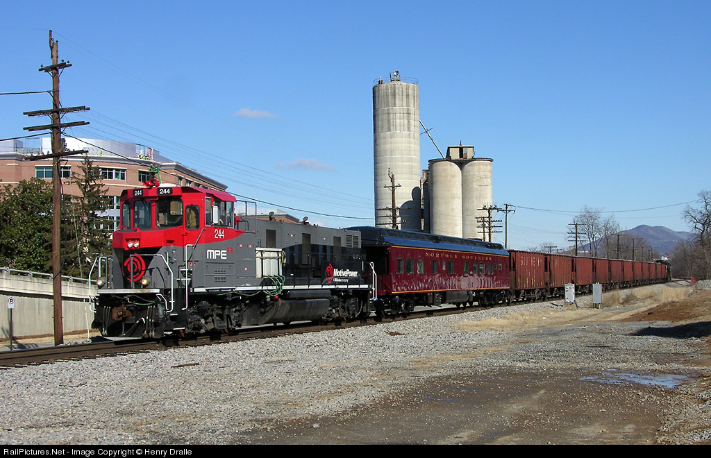 MPE 244 is on the point of an NS 995 test train in Roanoke. This train is making runs up Starkey Hill (the NS testing hill), evaluating tonnage and traction abilities. The unit on the opposite end is NS 5609 and the research car is #32.