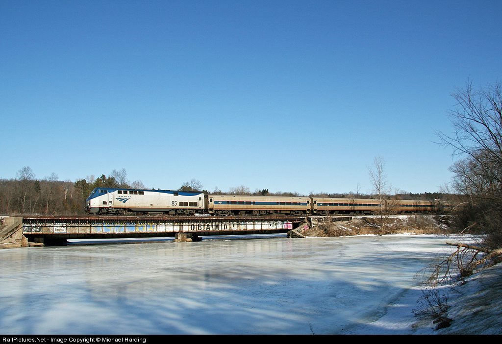 | Heading West after their station stop at Ann Arbor, Amtrak 353 is on time and has a Genesis on both ends today. Note the prominent "political" graffitti on the bridge... |